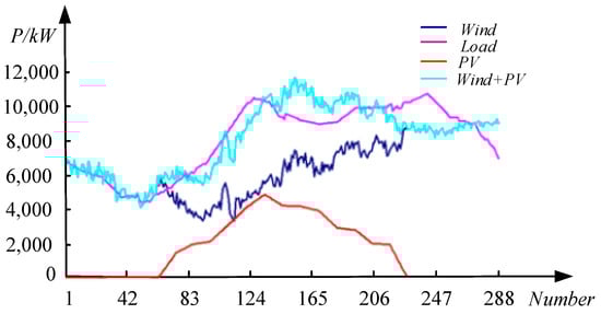 This paper used the case of an isolated microgrid in north China to verify the proposed method. The wind speed data at the sampling interval of 5 min in the current area can be calculated by the formulas (1) and (2). According to the annual average meteorological data of local light intensity and temperature, Homer software was used to simulate the light data with a 1-h interval. The light data of 5 min sampling interval is obtained by data fitting, and the output power of PV can be calculated by formula (3). The daily load data of 1 h was processed by the same method, and 10% random fluctuation was added to get the corresponding daily load curve. The actual power of the load and the calculated wind/PV output for one day are shown in Figure 3. For this example, the project life was 15 years and the interval time was 5 min. LPSPmax was 4%. SPSPmax was 12%. The details of HESS are shown in Table 1.