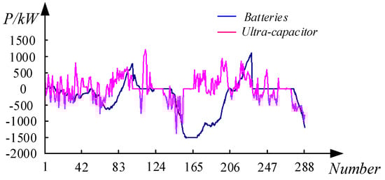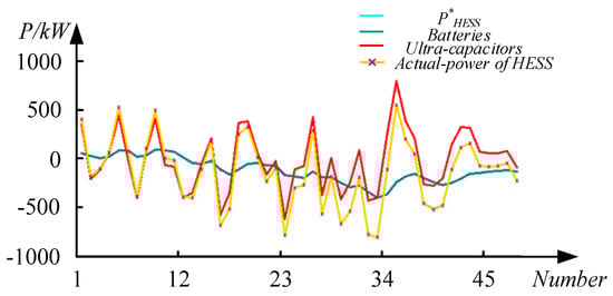 There were differences between the actual HESS power and in Figure 8. Limited by the batteries’ rated power, the maximum charging power of the batteries was 1500 kW. Therefore, the surplus power could not be completely absorbed because the ultracapacitors were limited by SoCuc,max. However, in the iterative operation of the algorithm, the energy overflow rate constraint of the system is implicit in the operation process in the form of penalty function, enough to satisfy the system requirements.