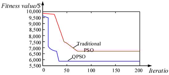 In this paper, the population size was M = 100, and the maximum number of iterations was set to 200. The battery capacities were 7807.84 kWh, the ultracapacitor capacities were 1985.16 kWh, and the daily cost was $5902.36.