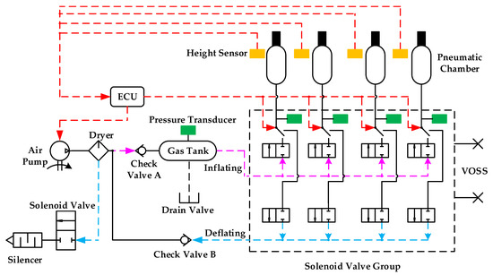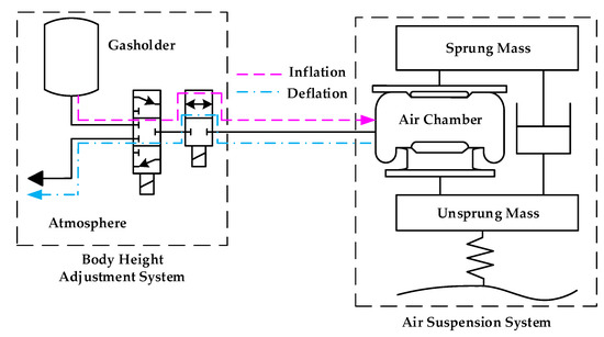 The electric vehicle semi-active suspension system has attracted more and more attention [1,2,3,4] because it can effectively improve the ride comfort, handling stability and trafficability to ensure the comfort of passengers, the integrity of goods and the safety of driving [5,6,7]. The electronically controlled air suspension (ECAS) belongs to the semi-active suspension class. It has been widely used in commercial vehicles [8], railway vehicles [9], passenger vehicles [10] and agricultural machines [11,12] because of its advantages of adjustable stiffness and height. In the past few years, the research on air suspension systems has mainly focused on three aspects: air suspension analysis modeling [13,14,15,16,17], electronic control system [18,19,20,21,22] and vehicle height control algorithms [23,24,25,26,27,28,29,30].