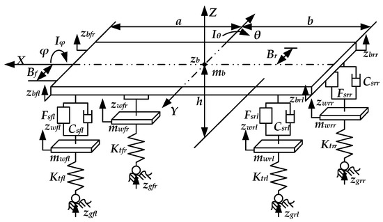 In this paper, the influence of vehicle height on vehicle ride comfort and vehicle attitude stability is studied when the vehicle is running in the longitudinal direction while the speed and road conditions are different. The main content of this model is the effect of air suspension on vehicle ride comfort and the vehicle handling and stability are not studied. Therefore, in order to make the modeling more pertinent and eliminate the influence of tire slip on vehicle body attitude, it is assumed that tire movement is pure rolling and wheel rotation is neglected in the process of modeling [31]. Sprung mass is regarded as a rigid body with lumped mass and tires are simplified to the combination of a rigid body with lumped mass and spring with equivalent stiffness Kt. It is neglected that the effect of air resistance and the vehicle speed is constant in the process of vehicle driving. Furthermore, the air suspension does not collide with the bumper block in the working process. According to Newton’s second law, a dynamic system model can be established as follows. Movement equation of vehicle body centroid is established as follows: