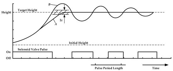 In general, actual vehicle height is compared with target height to determine whether the vehicle height has reacheed the target height. The control strategy selected in this paper is to use the static equilibrium position instead of suspension dynamic deflection as the adjustment basis. In order to verify the effectiveness of the control strategy, the dynamic deflection (as shown in Figure 4a) and the static equilibrium position (as shown in Figure 4b) are used to study the control effect. In the adjustment process, different target values are set according to different road conditions. The solenoid valve is closed when the static equilibrium position reaches the target value through the designed state observer. Subsequently, gas in the pneumatic spring will gradually reach steady state, such as curve A in Figure 5. Otherwise, there will be undesirable phenomena, such as repeated adjustment of height and over-inflating/over-deflating phenomena, which are shown as curve B in Figure 5.