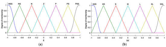 We set the membership function of input variables in Matlab/Simulink, as shown in Figure 7. On the basis of the fuzzy controller designed in this paper, a Mamdani algorithm is adopted in the inference engine and defuzzification is realized by using the centroid method.