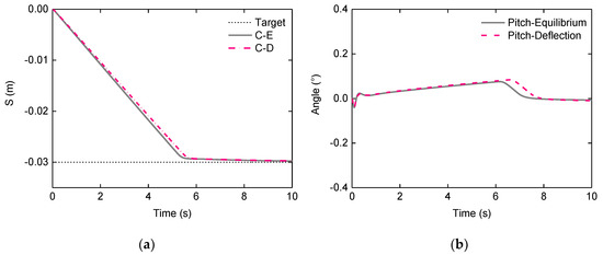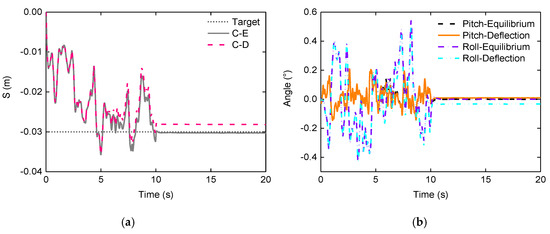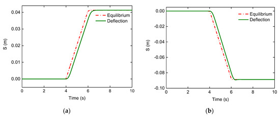 The suspension dynamic deflection can’t accurately indicate the actual suspension height change because it varies with road irregularities. It can be seen from Figure 16 that the height changes of the front left suspension and rear left suspension adjusted by dynamic deflection are −0.02774 m and −0.02703 m, respectively, and the control accuracy is lower than 93%. Height changes adjusted by the static equilibrium position are 0.03001 m and 0.02993 m, respectively, and the control accuracy is also above 99%. Therefore, the suspension height adjusted by dynamic deflection is far from the target height of −0.03 m, which does not meet the precision requirements. The height change of the vehicle centroid adjusted by dynamic deflection is 0.0282 m obtained from Figure 17, which doesn’t reach the desired height.