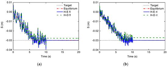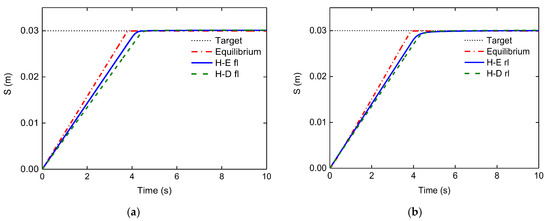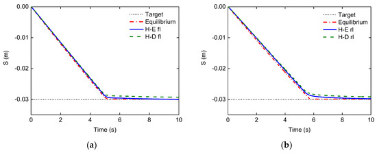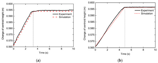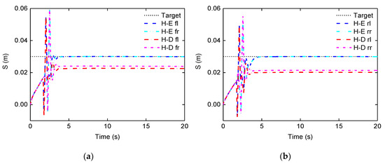 When the vehicle is running on a poor road, the vehicle body vibration is strong and the vehicle height increases 0.04 m, as seen in Figure 25a; while when the vehicle is running on a good road, the handling stability of the vehicle is particularly important and the vehicle height needs to reduce 0.04 m, as seen in Figure 25b. In these processes, the target heights of the centroid are set to 0.606 m and 0.566 m, respectively. The vehicle begins to decelerate from the 5 s point and vehicle has completely stopped at 10 s.