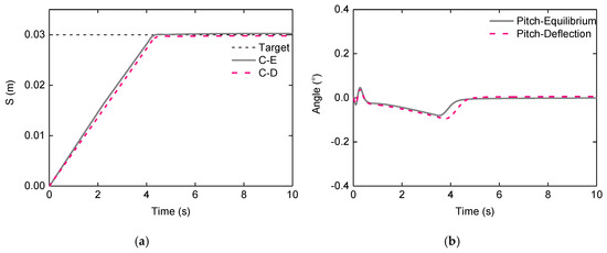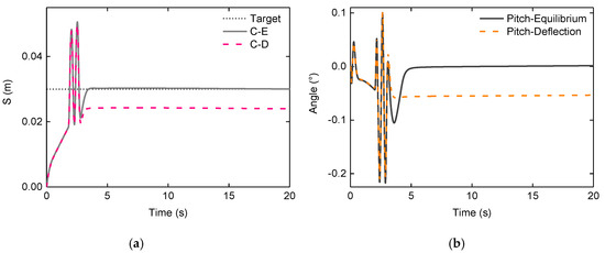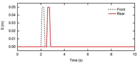 It is found from Figure 14 that the suspension deflection varies greatly at 2 s. The suspension height changes adjusted by dynamic deflection are as follows: 0.02257, 0.0239, 0.02014 and 0.02133 m. Suspension height changes adjusted by the static equilibrium position are as follows: 0.02995, 0.02994, 0.02998 and 0.02997 m. It can be seen that maximum error adjusted by dynamic deflection is over 0.006 m, which deviates from the target height. Furthermore, the height change of the vehicle centroid is 0.02399 m and it doesn’t reach the desired height, as seen in Figure 15a. However, because the static equilibrium position of the air suspension has strong robustness, it’s not disturbed by the road excitation. Therefore, when it is used to adjust suspension height, the effect of the excitation signal is very small. The control accuracy is over 97%, which meets the actual requirement. The height change of the vehicle centroid is 0.0305 m and its control accuracy can reach over 98.3%. Due to the interference of the speed control bump, the pitch angle is 0.05° and vehicle produces a pitch motion after the height is adjusted according to the suspension dynamic deflection. On the contrary, the vehicle body adjusted according to the static equilibrium position will gradually converge to a stationary state after passing over the speed bump. Therefore, the vehicle body posture adjusted by the static equilibrium position is more stable.