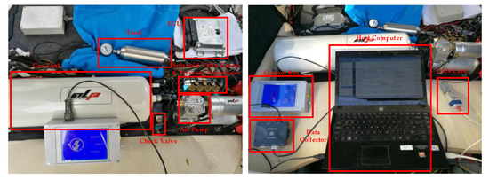 The components used in a realistic vehicle experiment are shown in Figure 18. The air pump is controlled by the ECU. There are two CAN buses for communication in the ECAS system. CAN1 bus is used to realize the communication between the control box and the system, and the CAN0 bus is used to download control programs into the ECU, collect height and pressure signals and communicate with the ECU to control the solenoid valves. The baud rate of CAN bus communication is set to 500 kbits/s and the cycle period of program is 20 ms. At the same time, the height signals and pressure signals of vehicle are also collected and analysed through DEWESoft X2.