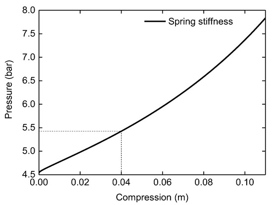 Firstly, the air suspension on the vehicle is tested by bench tests and its characteristic stiffness curve is shown in Figure 19. This curve shows the relationship between the pressure in pneumatic chamber and the suspension height change. The initial absolute pressure of the air suspension is set to 4.54 bar and the suspension height is in the lowest position. Because the travel L of the air suspension is −60–50 mm, air suspension is inflated to increase 110 mm. It can be obtained through the bench tests that the pressure in air suspension is 5.423 bar when the height of the air suspension increases 0.04 m.