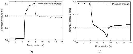 Simulation in AMESim using the air suspension parameters was used in the vehicle experiments. When the suspension height increases 0.04 m from the lowest position, the pressure changes are as shown in Figure 20a. As one can see from Figure 20a, the initial absolute pressure is 4.57 bar without inflating and the gas pressure is 5.42 bar when the suspension height increases 0.04 m. The simulation is in agreement with the experimental results. Although the instantaneous gas pressure is up to 6.0 bar and in the process of inflating it takes slightly longer, this is only the excess pressure of the local gas and the pressure is restored to 5.42 bar after the gas reaches the equilibrium state. When the suspension height reduces 0.04 m, the pressure changes as shown in Figure 20b. The initial absolute pressure is 5.441 bar and the gas pressure is 4.62 bar when the deflating process has ended. The simulation results show that model can effectively reflect the stiffness characteristics of the air suspension, so this model is used in the simulation.