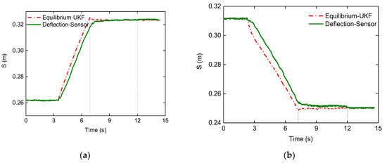 When the vehicle is running on the road, the vehicle height is adjusted. After a certain distance, the height changes of the dynamic deflection and the static equilibrium position are compared. Height and pressure signals are used by the UKF algorithm. We control the solenoid valves to inflate and deflate the pneumatic chamber for a period of time, respectively. At 12 s, the vehicle stops driving. The changes of vehicle suspension and the static equilibrium position of the front-left wheel are shown in Figure 22, where it can be seen from Figure 22a that when the vehicle is driving, the error between dynamic deflection and the static equilibrium position is caused by the road excitation. When the vehicle stops, the height changes of the static equilibrium position obtained are 0.32365 m and 0.25028 m, respectively. The deflection changes are 0.32341 m and 0.25034 m, respectively. The errors between the dynamic deflection and the static equilibrium position are 0.00024 m and 0.00006 m, respectively, and the accuracy of model is over 99%. It can also be seen that from the closing time of the solenoid valve to 12 s, the maximum error range between the dynamic deflection and the static equilibrium position is 0.00667 mm. Then, the dynamic deflection reduces 0.002 m at 12 s and it’s explained that the dynamic deflection does not correctly reflect the vehicle height change because of the effect of road excitation.