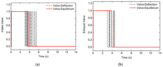 System responses after solenoid valves open at 2 s: (a) intake valve opening; (b) exhaust valve opening.