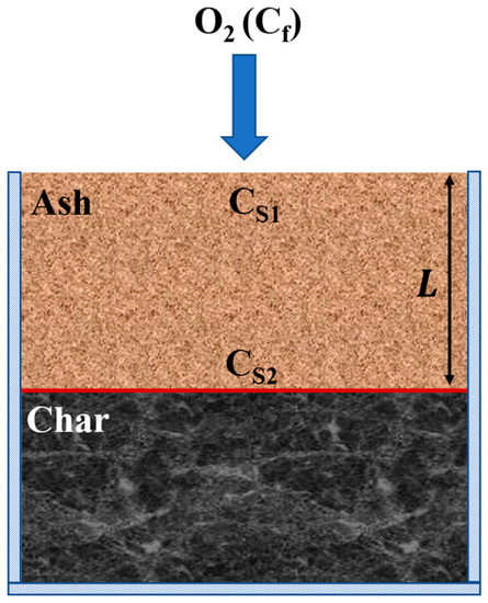 In principle, as shown in Figure 1, the mass transfer of O2 during the gasification of char with an ash layer includes the following steps: (a) diffusion of O2 with a concentration of Cf in the bulk gas to the external surface of the ash layer, (b) diffusion of O2 with a concentration of CS1 at the surface of ash layer to the char interface, and (c) reaction of O2 with a concentration of CS2 at the char interface with char following the first order reaction [25] respecting to O2 to produce CO then to CO2 as shown in our previous study [26]. Under the quasi-steady state, the flux of O2 () from the bulk gas to the external surface of ash layer is equal to the flux of O2 diffusing through the ash layer, as well as to the reaction of O2 at the char interface. These steps can be expressed by Equation (1), where Kc is the mass transfer coefficient of convection, L is the thickness of ash layer, De is the effective diffusivity in the ash layer, K is the rate constant of C-O2 reaction, while Cf, CS1 and CS2 are O2 concentration in the gas bulk, at the external surface of ash layer, and at the char surface, respectively: