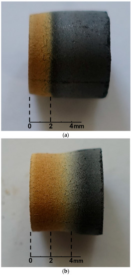 Samples subjected to gasification at 1273 K for different time: (a) with an ash layer of 2 mm; (b) with an ash layer of 4 mm.