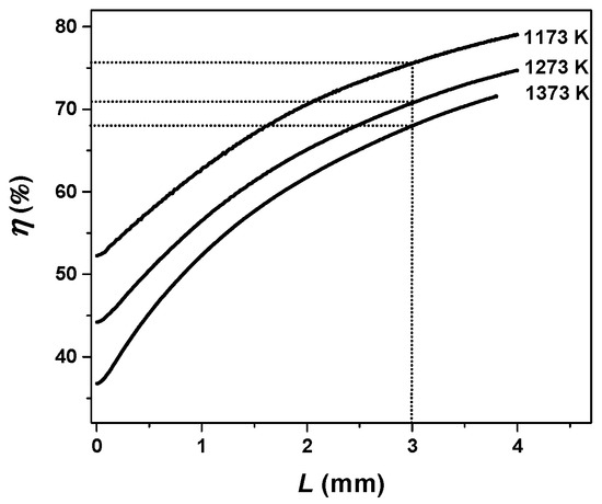 The temperature effect on η in Figure 8 shows that the diffusion resistance in ash layer is more important at a lower temperature than that at a higher temperature. For instance, at an ash layer thickness of 3 mm, the η is about 75.5% at 1173 K but 70.7% and 68.0% at 1273 and 1373 K, respectively.