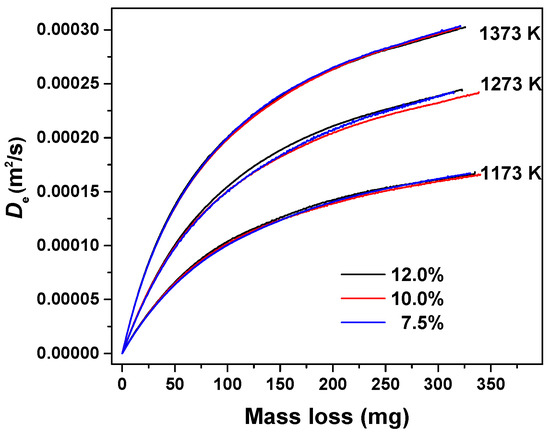 Figure 5 shows De determined by Equation (10). As expected De increases with an increase in temperature, 1.51 × 10−4 m2/s at 1173 K while 2.82 × 10−4 m2/s at 1373 K both at the mass loss of 250 mg, corresponding to an ash layer thickness of 3 mm. The range of De is the same as that determined in our previous study [26] in coal gasification (around 1 × 10−4 m2/s) and that reported by Chen et al. [31] for combustion of coal particles of 16 mm in diameter with 53% ash (1.5 × 10−4 m2/s at 1145 K). Figure 5 also shows that De increases with increasing time, indicating increasing pore size or fractures in the ash layer over time. This behavior is similar to that reported by Sotirchos [32], who studied combustion of a char with 25% ash and showed increasing macropore volume over time for ash layers of millimeter thick, and increasing De over time in a range around 1 × 10−4 m2/s at 1173 K. Clearly, the compressed cylindrical char sample prepared in this work can be used to study De of char particles.