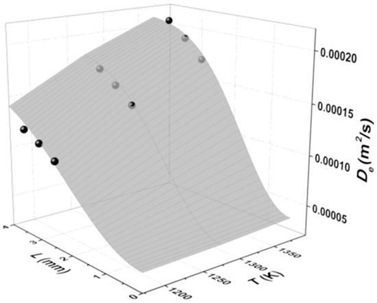 Figure 12 shows De determined by Equation (20) and that observed in the experiments (dots) under different temperatures and ash layer thickness. Clearly the De determined from Equation (20) fits the experimental data well with small residual sum of square, approximately 7.1 × 10−11 m4/s2 at 1273 K and ash layer thickness of 2.5–3.5 mm, for example.