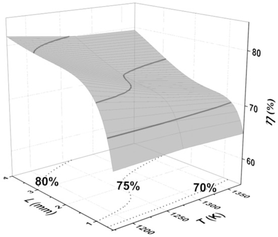 Figure 13 shows η, the proportion of internal diffusion resistance in overall mass transfer resistance defined earlier by Equation (11), under different temperatures and ash layer thickness. The contours of η of 70, 75 and 80% show that the internal diffusion resistance plays a major role in overall mass transfer resistance, more than 75% when the ash layer is thicker than 2.5 mm at 1250–1300 K, for example.