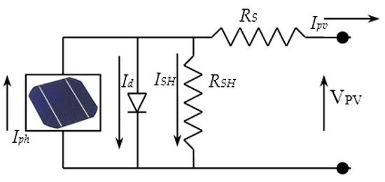 where n is defined as the diode’s ideality factor (typically between 1 and 2), and RS and RSH represent the series and shunt resistors. Manufacturers often tend to supply the RS value in the datasheet of the product [11]. If not provided, the equation of RS can be extracted by differentiating the Equation (1) then rearranging it in the RS phrase.