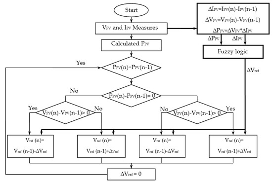 To eliminate the limitation that exists in the conventional P&O algorithm’s implementations, we use a P&O algorithm based on the modified conventional algorithm, in which we implemented a fuzzy logic controller block to provide a variable step of reference voltage. The suggested modified P&O algorithm’s flowchart is shown in Figure 3.