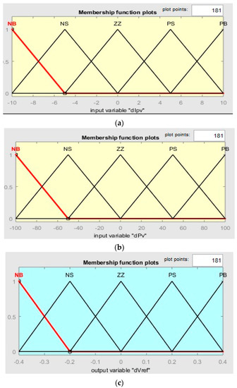 In this model, the membership function of the output and input variables used as presented in Figure 5, all membership functions (ΔPPV, ΔIPV, ΔVref), are expressed with a triangular function. Five linguistic terms are defined: NB as negative big, NS as negative small, ZZ as zero, PS as positive small, and PB as positive big.