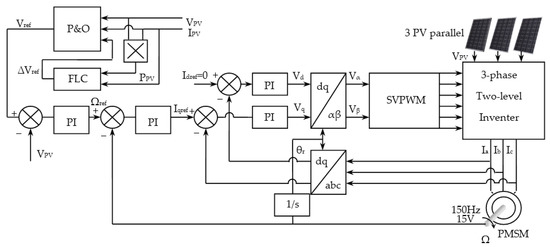 The sign p shows the number of pairs of poles. Based on the authors’ approach [21], the pole placement method can design the PI controller’s parameters. In Figure 6, a global schematic presentation of the PMSM controlled by a vector control powered by an inverter is shown. The desired voltage Vref will be created according to the power generated from three PV panels to consume all the power generated from the panel.