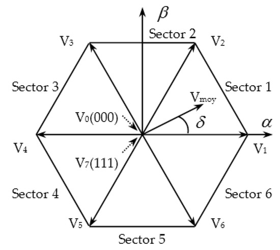 The eight voltage vectors redefined by the association of the switches are represented in the plane (α, β) by Figure 7, [22,23,24,25].