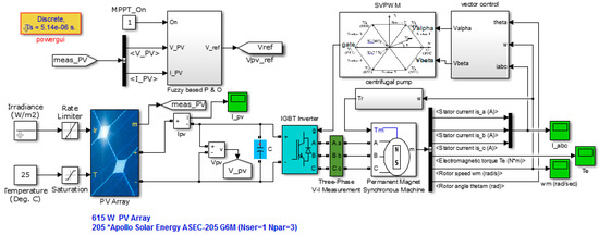 The simulation has been done using MATLAB/Sim-Power-Systems blocks as clarified in Figure 8. The modified P&O block requires the VPV and IPV of the PV array to estimate the reference voltage shown in Figure 8. The Vref is compared with VPV and regulated by a PI controller to define the reference speed of the pump motor. The time sampling step of the models of the two blocks (control blocks and power blocks) is taken as 5.14 μs.