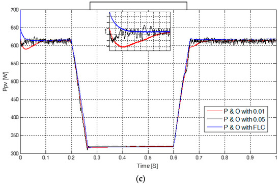 Figure 9b represent variation of voltage reference step size at 0.2 s and 0.6 s. Figure 9c shows that the steady-state oscillation has been totally eliminated in the case of the FLC-based P&O and when the output power of the PV generator is greater than 615 W. In addition, the FLC-based P&O offers a faster dynamic response than the P&O of 0.01 and 0.05.