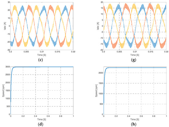 In the second part, the results of the simulation were obtained to show the performance of the fuzzy logic-based P&O algorithm under different conditions such as quick changes of irradiation. The results of the drive system of the solar pumping motor are obtained to operate at 25 °C and 1000 W/m2. They are given in Figure 10a–d. The power characteristic of the photovoltaic generator is shown in Figure 10a with a maximum power point determined as 615 W. The PV generator’s voltage and current are changed as shown in Figure 10b. It should be known that the PV generator’s voltage is adjusted to the MPP of about 26 V. The three-phase stator currents are given in Figure 10c. The motor speed is changed, as illustrated in Figure 10d, which is limited to the maximum available speed of about 3000 rpm. As a second work, the irradiation is adjusted to 500 W/m2. The results are given in Figure 10e–h for this adjusted condition. In this circumstance, the MPP of the PV generator is obtained at about 315 W, as presented in Figure 10e. The photovoltaic generator’s current is decreased from 24 A to 12 A, as illustrated in Figure 10f. Depending on this current decrease, the stator’s currents and the motor speed are decreased as shown in Figure 10g–h. The motor speed is decreased from 2980 rpm to 2250 rpm. The results show that the motor operates at the point of maximum power.