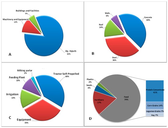 The results obtained from the indirect energy analyses at the farm level show, on average (Table 3), a yearly incidence of 125 GJ embodied in buildings and facilities, 283 GJ in machinery and 2051 GJ incorporated in agricultural inputs, expressed as an average per farm. As shown in Figure 1A, all the agricultural inputs represent 83% of the total indirect energy found at the farm level, whereas buildings and machinery contribute only 5% and 12%, respectively. Expressing the overall indirect energy as indicators, about 20,066 MJ·head−1 and 6130 MJ·t FPCM−1 are annually required on average.
