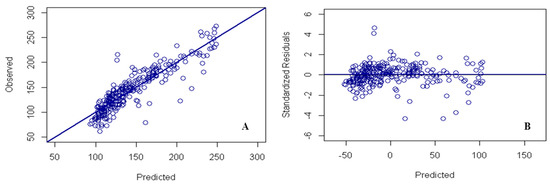 Figure 2A shows the regression line of the observed values against predicted values, which overlaps the line of unity (slope = 1). This result shows that the model might predict the indirect energy requirements without under- or over-prediction error. Figure 2B shows the regression line of the standardized residuals against predicted values, which overlays the line crossing zero residuals. The standardized residuals did not display any evident outline, attesting to the homoscedasticity of the residuals (random distribution).