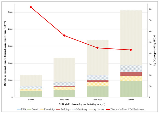 The largest farms were also linked to larger levels of indirect energy, 2848 GJ of cumulative indirect energy (class of > 9000) against 840 GJ (class of < 5000) and related CO2 emissions. However, when comparing total embodied energy and total emissions expressed as MJ and kg·CO2-eq per 100 kg of milk produced, a negative trend was found in larger farms, which held less requirements of indirect energy and emitted less carbon dioxide into the environment (from 57–33 kg·CO2-eq per 100 kg of FPCM).