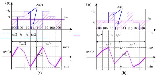 dc-link current and voltage ripple in one switching period: (a) Case A (0 ≤ ≤ π/3, i1 ≥ Idc), (b) Case B (0 ≤ ≤ π/3, i1 < Idc).