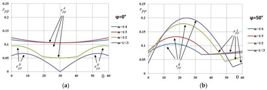 It is noteworthy that the normalized voltage ripple amplitude rpp(ϑ) has a wide excursion, generally ranging between 0 and 0.25, with higher values corresponding to the higher load phase angles. The maximum of the normalized peak-to-peak voltage switching ripple amplitude (Equation (21)) is obtained as a function of the modulation index over the period = [0, 60°]. Different traces are depicted in Figure 5 considering different output phase angles.
