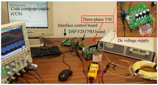 The whole experimental setup is shown in Figure 7. It consists of a three-phase custom-made VSI using the Mitsubishi PS22A76 intelligent power IGBT module (1200 V, 25 A, Mitsubishi Electric Corporation, Tokyo, Japan), driven by the DSP microcontroller board via an optical interface board. DSP board (TMS320F28379D, Texas Instruments, Dallas, TX, USA) is programmed by Code Composer Studio IDE (CCS) (Texas Instruments, Dallas, TX, USA) with the possibility of real-time adjustment of the modulation parameters by a computer interface.