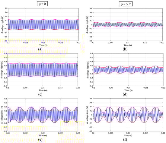 Simulation results are presented in Figure 8. The peak-to-peak envelopes calculated by Equation (19) as the half of peak-to-peak dc-link voltage ripple amplitude ∆vpp/2(t) (red traces) are shown together with the instantaneous dc-link voltage switching ripple ∆v(t) (blue trace) over a fundamental period (T = 20 ms). Two values of the output phase angles = 0 and =50° are considered (left and right column, respectively) and four values of the modulation index (m = 0.25, 0.33, 0.5 and 0.577; from top to bottom) to cover the whole modulation range.
