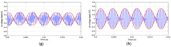 The switching ripple ∆v(t) has been obtained both numerically and experimentally by properly filtering the instantaneous dc-link voltage, according to Equation (11). In the case of the experimental results, the “ac coupling” built-in function of the oscilloscope has been used together with the built-in low-pass filter in order to better clean the waveforms.