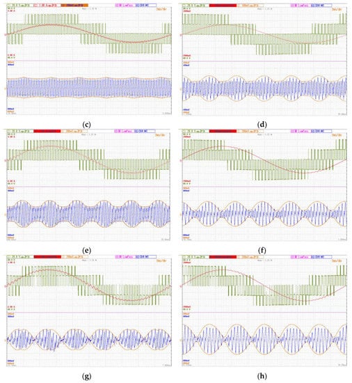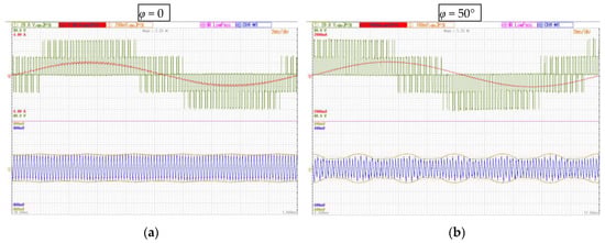 Experimental results are shown by Yokogawa DLM 2024 oscilloscope screenshots (Yokogawa Electric Corporation, Tokyo, Japan) collected in Figure 9. Two values of the output phase angles = 0 and =50° have been considered (left and right column, respectively) and four values of the modulation index—m = 0.25, 0.33, 0.5 and 0.577 (from top to bottom)—to cover the whole modulation range, as in the simulations presented in Figure 8. In all screenshots, two upper traces present the load voltage and current (green and red traces, respectively) and the bottom (blue) trace presents the measured dc-link voltage switching ripple ∆v(t). The additional two orange traces present the calculated envelopes of the voltage ripple (∆vpp/2(t)) provided by the DSP board and displayed using DAC block with a proper voltage scaling.