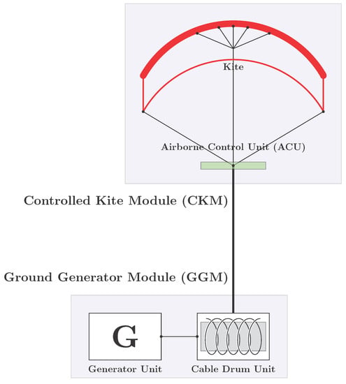 The AWES considered in the paper is a kite generator system (KGS) involving a controlled kite module (CKM) connected to a ground generator module (GGM) by a single tether (see Figure 1). Among the recent AWES proposals, the KGS type is one of the most simple, yet appears to be one of the most promising. One of its main advantages is having the generator on the ground, reducing not only safety risks but also the building costs since it does not require heavy infrastructures. The CKM comprises the kite and the airborne control unit (ACU) while the GGM comprises the generator unit and the cable drum unit.