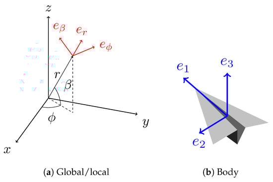 We model the forces acting on the kite in a spherical coordinate system positioned at the center of the kite, similarly to [,]. We consider three coordinate systems: