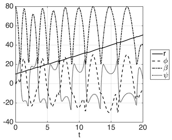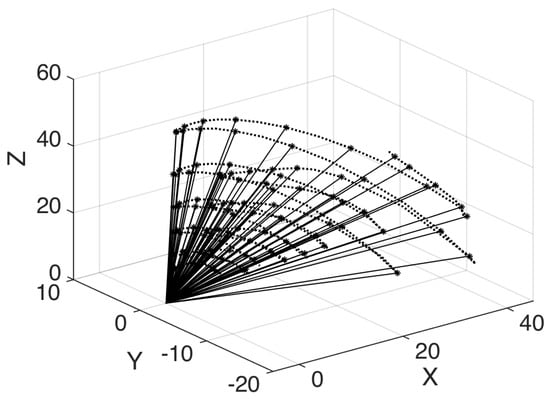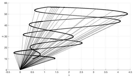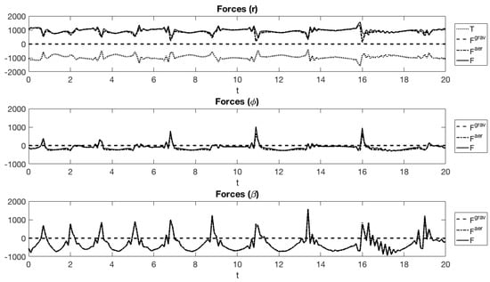 Details of this technique and its use in other nonlinear systems are reported in [,]. The refinement strategy resulted in higher accuracy levels with a lower overall computational time when compared with the use of traditional meshes with equidistant spacing in the continuous-time OCP, and with a priori discretized versions of the OCP. In particular, the time to obtain a solution with a similar level of accuracy represented 4% to 30% of the time needed using traditional equidistant meshes. The benefits of using an adaptive time mesh are particularly more evident in highly nonlinear systems, as is the case of the controlled kite and other nonholonomic systems. The technique led to the use of finer meshes in time intervals where sharp turns of the kite occur. A simplified problem in two dimensions was solved with the AMR 29 times faster than with an equidistant mesh leading to the same level of accuracy. The complete 3D problem was successfully solved using the AMR strategy, while when using an equidistant mesh leading to the same level of accuracy, the maximum number of iterations of the nonlinear optimization solver was exceeded.
