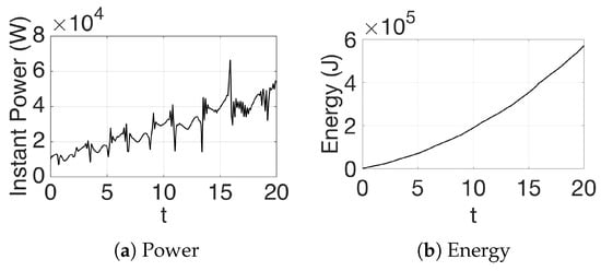We consider the problem of optimizing power production in a given time period (see e.g., [,,] for a reference on optimal control and on the corresponding numerical methods). The instant power production is given by and the energy in the interval is