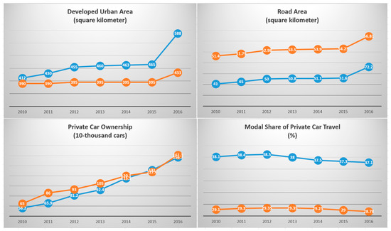 Urban growth, motorization and modal share of private car travel in Shenyang (blue nodes) and Dalian (orange nodes).