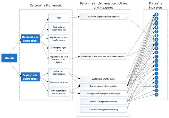 From the data showing the performance of transit metropolis indicators in Shenyang and Dalian, we can conclude that both cities have successfully implemented the transit metropolis program, albeit in different ways. Following Cervero’s framework, we compare the implementation policies in Shenyang and Dalian (Figure 3 and Figure 4).