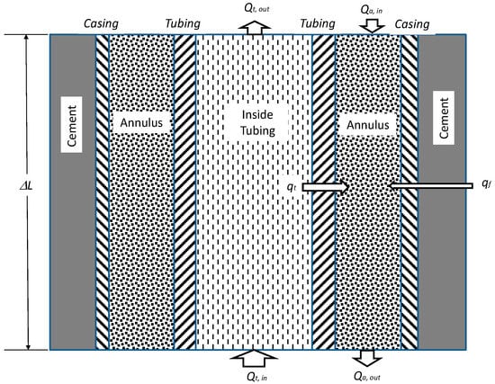 where Qa,in is the heat energy brought into the annular element by the annular fluid due to convection; qf is the heat transfer from the formation rock to the annulus due to conduction; qt is the heat transfer from the tubing fluid to the annulus due to conduction; Qa,out is the heat energy carried away from the annular element by the annular fluid due to convection; Qa,change is the change of heat energy in the annular fluid in the element.