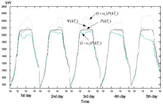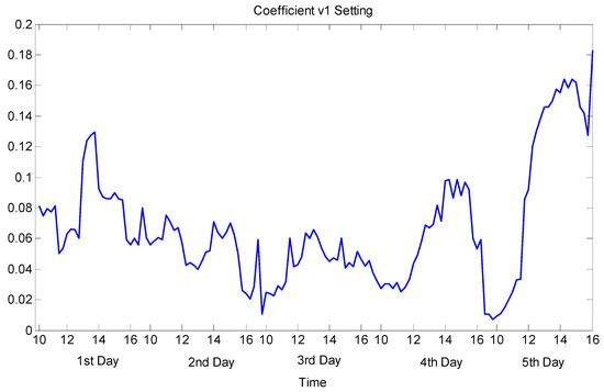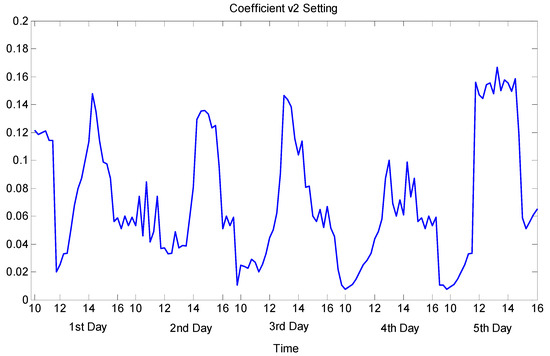 Recall that v1 and v2 in association with the membership function in (10) represent the fuzzy constraint in (8) that the calculated load shed greater than or equal to the target load P(·) to a certain degree of precision tolerance. Both coefficients v1 and v2 could be either constants or time-varying functions since the degree of precision tolerance for the fuzzy constraint in (8) can vary with the temperature, load in regional power system, or time of a day, etc. In this paper, the variations of v1 and v2 are both set as time-varying functions, as shown in Figure 4 and Figure 5, respectively. Using the proposed optimal real-time scheduling approach based on fuzzy linear programming, the calculated load shed, , is illustrated in Figure 6. Both of the upper and lower boundaries of fuzzy constraints in (8), denoted as and , respectively, as well as the target load shedding profile are also compared with in Figure 6. In Figure 6, it is shown that the optimized load shed matches the target load well in response to the variations in target load tolerance. Meanwhile, Figure 7a,b illustrate the optimized shedding ratios and the controllable load of customer with the largest capacity.