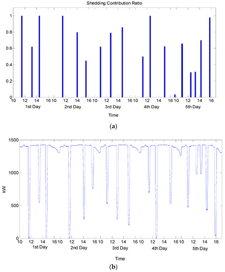 (a) Variation of optimized load shedding contribution ratios obtained by customer with the largest capacity. (b) Variation of controllable load profile for customer with the largest capacity.