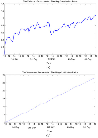Changes of standard deviation of shedding contribution ratios (a) with (b) without considering the filtering scheme in defined (20).