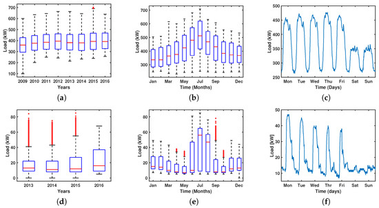 As a descriptive analysis of the electrical load, we used a boxplot representation of the available database, as shown in Figure 1a. We note the presence of a long-term linear trend. In Figure 1b, we represent the yearly profile (e.g., year 2015), in which we can observe the seasonal effect of the time series as the load increased during the summer months (from June to August). Figure 1c represents the week/day profile from the HUF, for which different load patterns can be observed on weekdays and weekends.