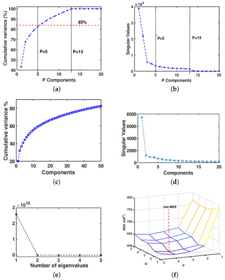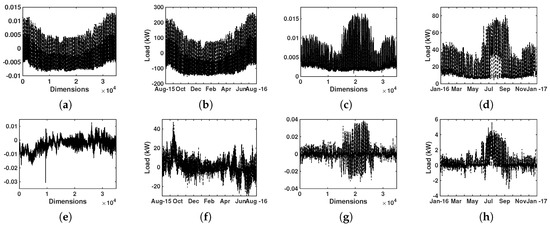 One of the most widely used methods of MVA is PCA, which extracts relevant information from a dataset and allows us to represent it as a set of new orthogonal variables, referred to as principal components [8,9]. In order to analyze the dataset of interest with PCA, we arranged the temporal observations of the electrical load in a data matrix as follows. With denoting the time series of available data uniformly sampled every 15 min, its entries were arranged into the matrix , where (number of quarter-hour samples in a week), and is the number of weeks in the dataset. Having the data in this form, each row corresponded to a particular time of the week (e.g., Mondays at 8:15 AM) and contained a sequence of one-week-separated load measurements. Moreover, each of the N columns represented a set of by-week measurements (e.g., loads of the 10th week of 2011 sampled every 15 min). For PCA analysis, it was preferable to arrange the training data into a square matrix; the weekly arrangement allowed us to obtain a semi-square matrix that facilitated the calculation of its singular values.